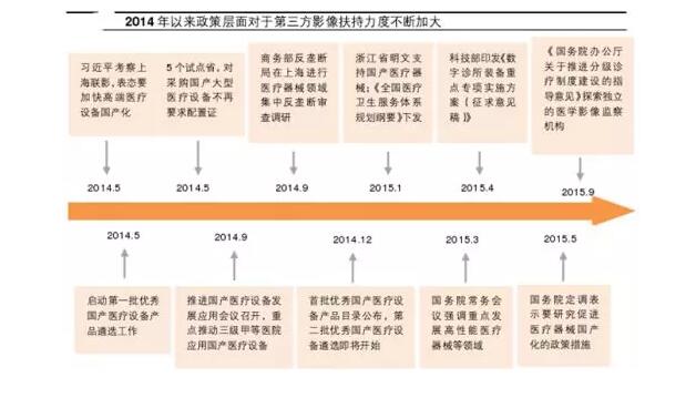 國內(nèi)的醫(yī)學(xué)影像中心復(fù)制了這種模式,但初期受限于人才引進(jìn)難、資金籌集少、隱形歧視和政策限制等原因,彼時獨(dú)立醫(yī)學(xué)影像中心在國內(nèi)發(fā)展緩慢。2016年8月,衛(wèi)計(jì)委發(fā)布《醫(yī)學(xué)影像診斷中心基本標(biāo)準(zhǔn)和管理規(guī)范(試行)》,首次明確了第三方醫(yī)學(xué)影像診斷中心獨(dú)立法人地位,其后隨著“十三五”醫(yī)改規(guī)劃中“加快社會辦醫(yī)”的內(nèi)容推出和醫(yī)療改革的不斷推進(jìn),行業(yè)終于迎來轉(zhuǎn)機(jī)。