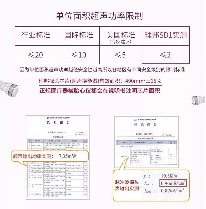 此外,SD1胎心多普勒儀的單位輸出功率是2mW/cm2,通常單位面積超聲功率越低,安全性越高,因此全球各地對(duì)輸出功率均有嚴(yán)格的安全級(jí)別限制標(biāo)準(zhǔn):國(guó)家行業(yè)標(biāo)準(zhǔn)≦20mW/cm2,國(guó)際標(biāo)準(zhǔn)≤10mW/cm2,美國(guó)標(biāo)準(zhǔn)≤5mW/cm2,而理邦儀器胎心監(jiān)護(hù)產(chǎn)品的輸出功率能夠做到2mW/cm2,安全性級(jí)別更高。