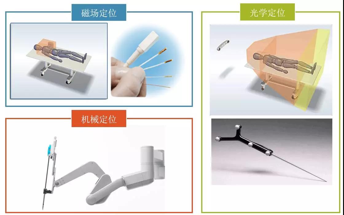 目前常見(jiàn)三種定位系統(tǒng) :1)磁場(chǎng)定位;2)光學(xué)定位;3)機(jī)械定位。這三種定位系統(tǒng)在定位精度上都能滿足目前手術(shù)導(dǎo)航系統(tǒng)的需求,但每種系統(tǒng)都有其局限性:磁場(chǎng)定位易受鐵磁性物體干擾,而且不能和MRI設(shè)備同時(shí)使用,精度約為1mm和0.5°;光學(xué)定位必須保證光路暢通,且所追蹤物體必須為剛性,其分別率可達(dá)到(<0.1mm);機(jī)械定位靈活性有限,設(shè)備所占體積較大。對(duì)于腹腔手術(shù)而言,例如肝臟等軟組織多位于人體較深部位,光學(xué)定位可能會(huì)受到一定的限制,通過(guò)腹腔鏡進(jìn)行機(jī)械定位是目前手術(shù)機(jī)器人的主流技術(shù)選擇。