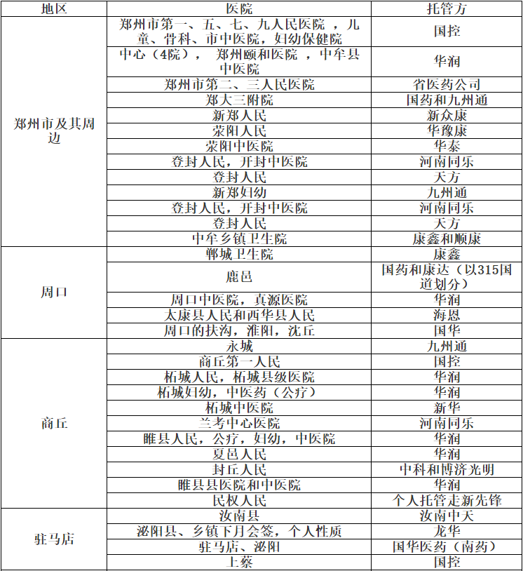 事實(shí)上,九州通、華潤醫(yī)藥、國藥等藥事巨頭近年來高歌猛進(jìn)的藥房托管已經(jīng)為今天的耗材集采和托管服務(wù)埋下了深厚的伏筆——本質(zhì)是大規(guī)模并購后的醫(yī)藥物流服務(wù)延伸入院的頂層利益格局的滲透。下面是河南省在2015年的藥事(含部分耗材)供應(yīng)托管統(tǒng)計(jì)表,有興趣的同仁可以深度了解一下: