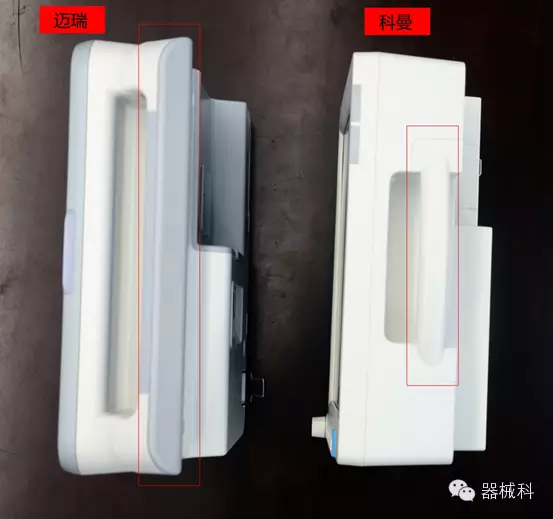 科曼與邁瑞因機(jī)身尺寸上有區(qū)別,所以手柄方面,科曼明顯比邁瑞要小??坡捎么蠡《龋尸F(xiàn)橢圓截面的設(shè)計;邁瑞采用方形小圓角,折疊活動式的提手,塑膠包裹。手柄嬌小,不利于握持,但重心集中,更穩(wěn)定;手柄碩大,活動范圍廣,卻也容易晃動。