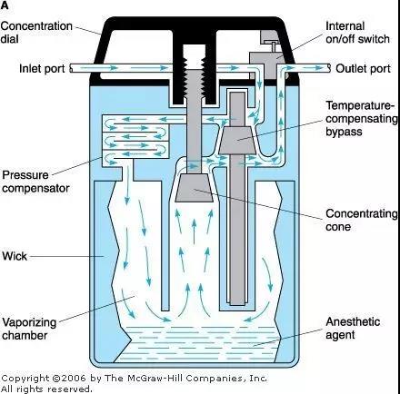 麻醉藥物經(jīng)揮發(fā)罐生成麻醉蒸氣,并控制所需定量的麻醉蒸氣進(jìn)入呼吸回路,隨混合氣體一起送給患者。
