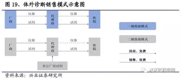 醫(yī)院是產(chǎn)業(yè)鏈上最強(qiáng)勢(shì)的一環(huán),國(guó)產(chǎn)產(chǎn)品對(duì)醫(yī)院的吸引力決定著國(guó)產(chǎn)替代進(jìn)程。在銷(xiāo)售模式上,公司多采用直銷(xiāo)和經(jīng)銷(xiāo)相結(jié)合,以經(jīng)銷(xiāo)為主。對(duì)于醫(yī)院終端,儀器基本以投放獲得,廠商以搭配銷(xiāo)售試劑的方式獲得收益。體外檢測(cè)等醫(yī)療服務(wù)由政府統(tǒng)一定價(jià),應(yīng)用化學(xué)發(fā)光法可相應(yīng)提高收費(fèi)標(biāo)準(zhǔn)(例如:福建省用化學(xué)發(fā)光法可加價(jià)80%)。因此,試劑屬于醫(yī)院的“成本項(xiàng)”,醫(yī)院有動(dòng)力對(duì)檢測(cè)方法進(jìn)行升級(jí)迭代,但卻并沒(méi)有動(dòng)力去特意抬高價(jià)格,在相同條件下會(huì)考慮試劑性?xún)r(jià)比,相對(duì)市場(chǎng)化。