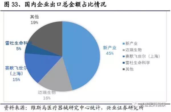 渠道能力強(qiáng),國(guó)內(nèi)外銷(xiāo)售情況表現(xiàn)不俗。新產(chǎn)業(yè)采用經(jīng)銷(xiāo)為主,直銷(xiāo)為輔的模式進(jìn)行銷(xiāo)售。在國(guó)內(nèi)市場(chǎng),新產(chǎn)業(yè)終端用戶(hù)分布范圍廣,省份分散,覆蓋醫(yī)院3000多家。其中,二級(jí)醫(yī)院有1千多家,三級(jí)醫(yī)院近1千家,一級(jí)醫(yī)院較少。今后,一級(jí)醫(yī)院市場(chǎng)將被充分開(kāi)發(fā),將通過(guò)自購(gòu)或者區(qū)域檢驗(yàn)中心的方式,將免疫檢測(cè)技術(shù)更新至化學(xué)發(fā)光法,市場(chǎng)空間巨大。在出口方面,儀器出口收入占到總收入近一半,試劑出口收入占到10%左右。2016年出口總額為國(guó)內(nèi)第一,占到總金額的45.6%。